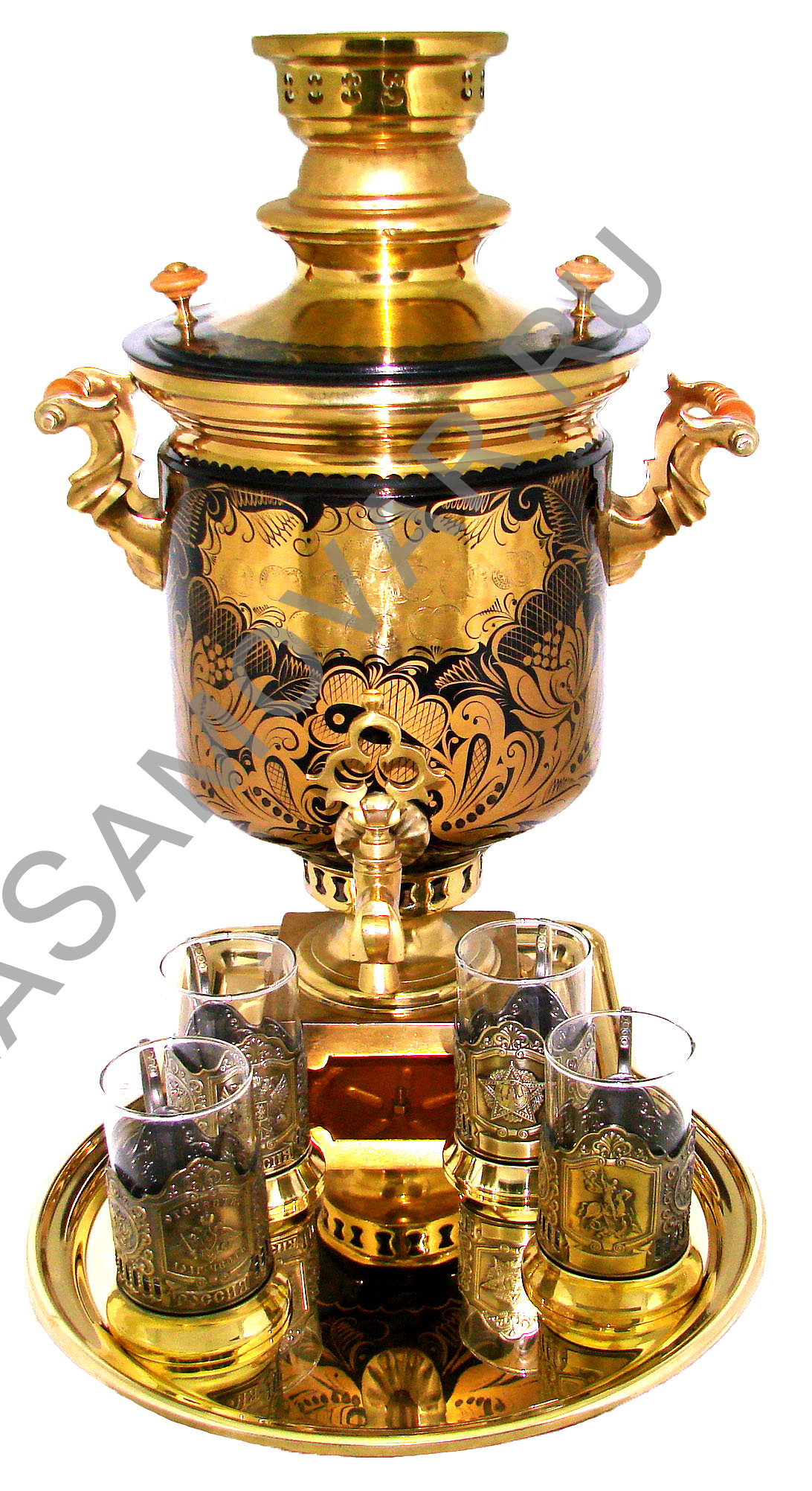 Самовар антикварный, электрический 10 л формы банка с художественной росписью (с медалями) в наборе с подстаканниками