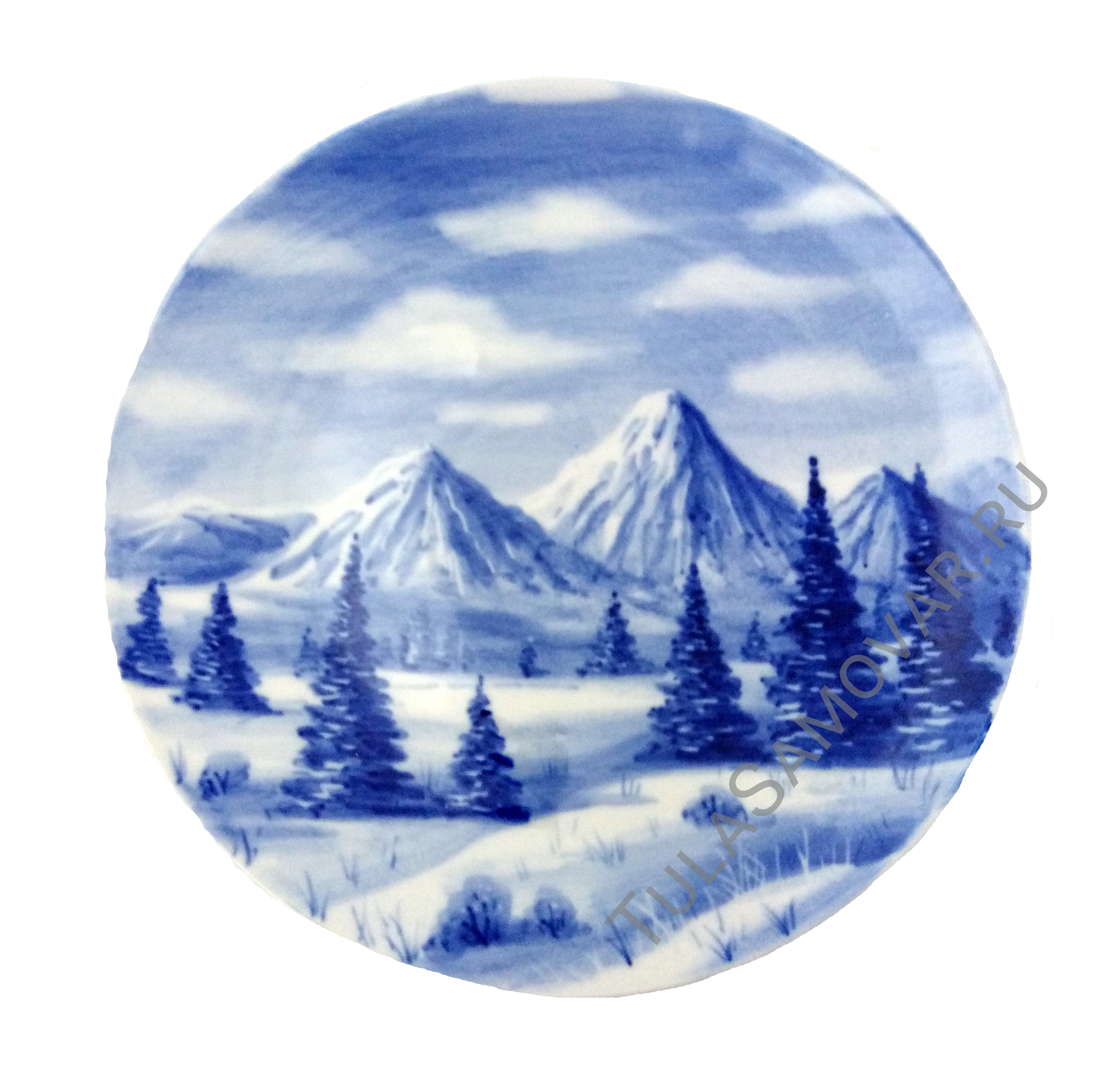 Гжель. Плакетка круглая Д-20 см "Горы"